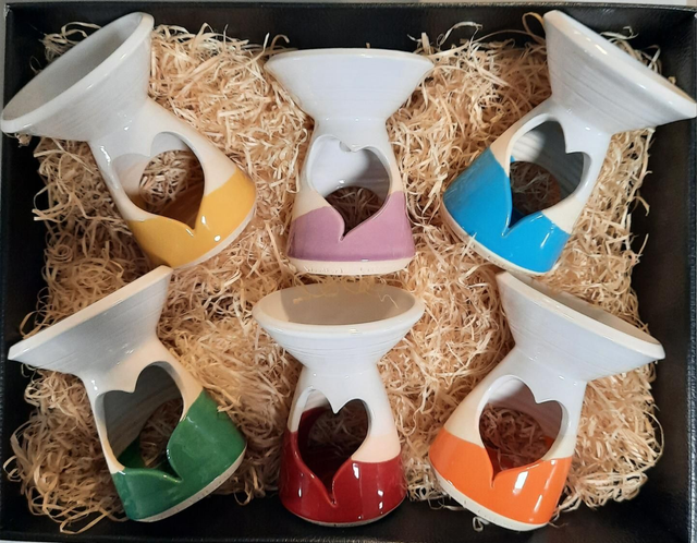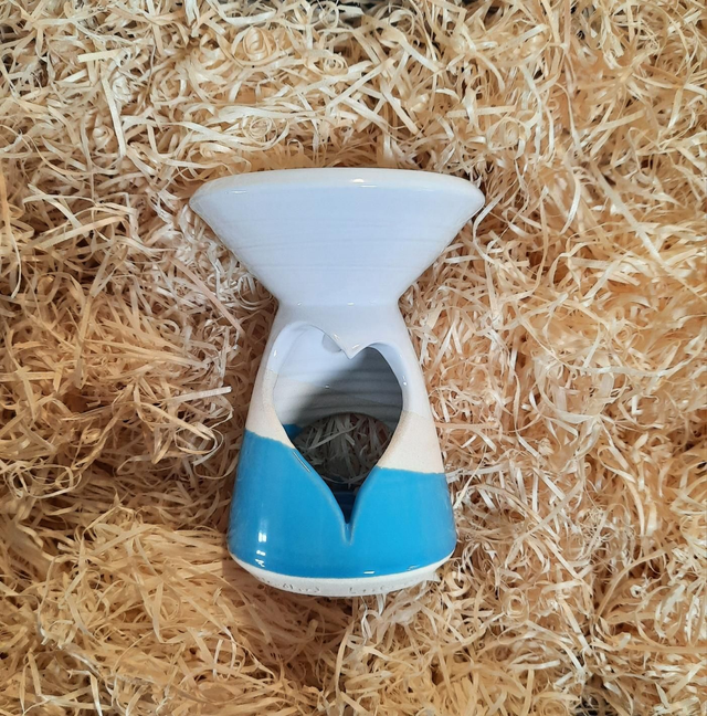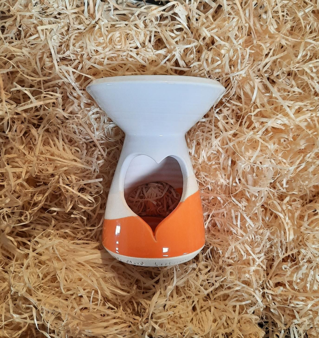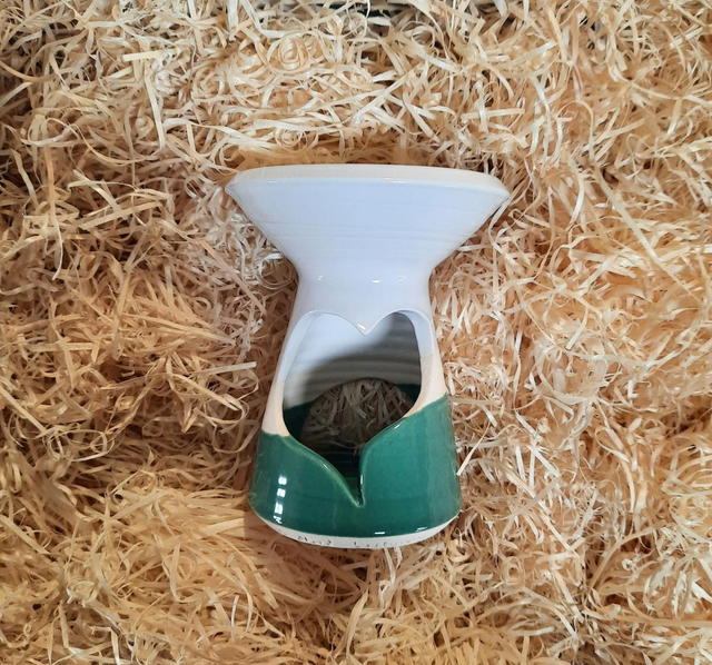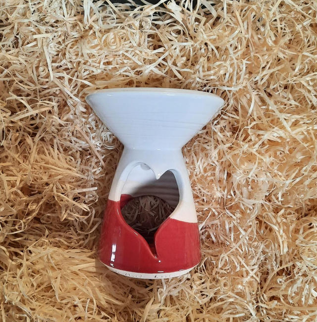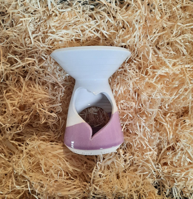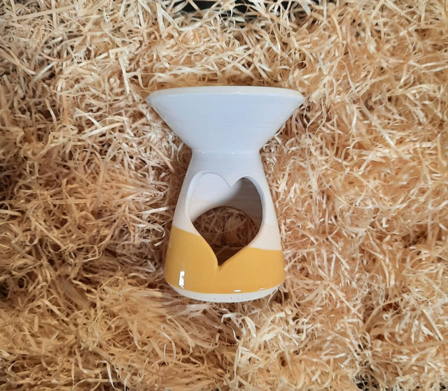Burner for wax melts or essential oils.. Stoneware clay glazed in white and coloured glaze with a section of exposed unglazed clay between colours.. As a handthrown piece, each heart ❤️ is cut freehand, colours and styles will vary from photo shown..