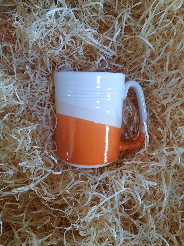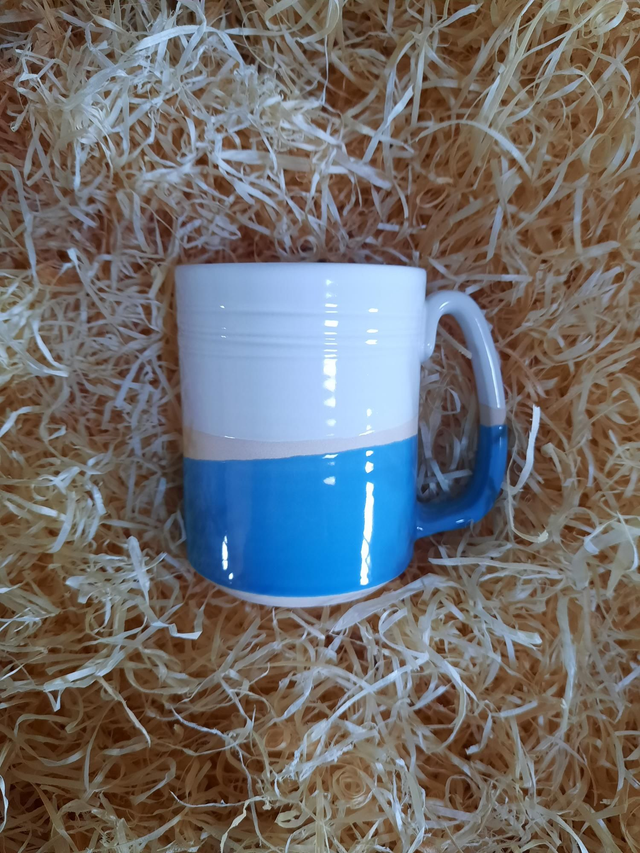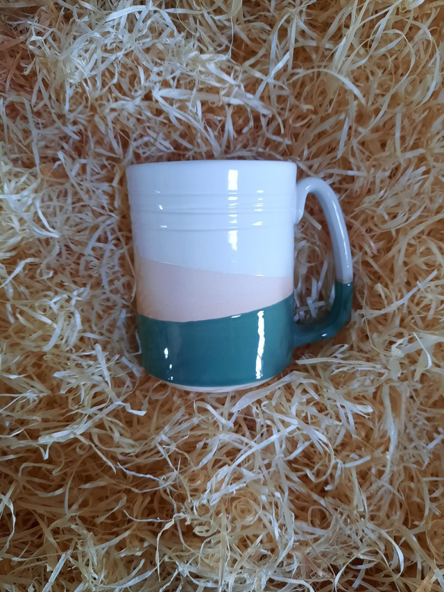 Tall Mug, white and coloured glaze with section of exposed unglazed clay between colours, product is hand thrown, style and colour may vary from image shown. Approx 12fl.oz