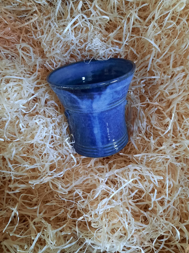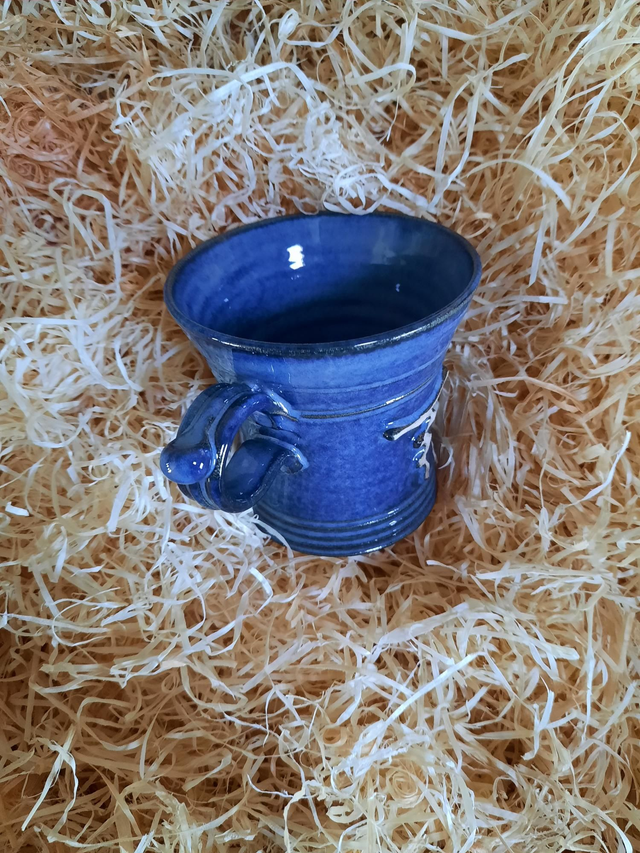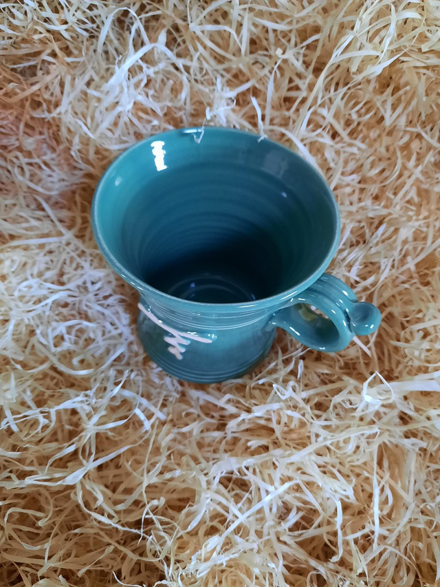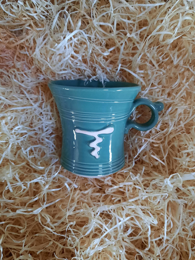 Tall Mug, glazed in a solid colour with a decorative unglazed design, product is hand thrown, style and colour may vary from photo.